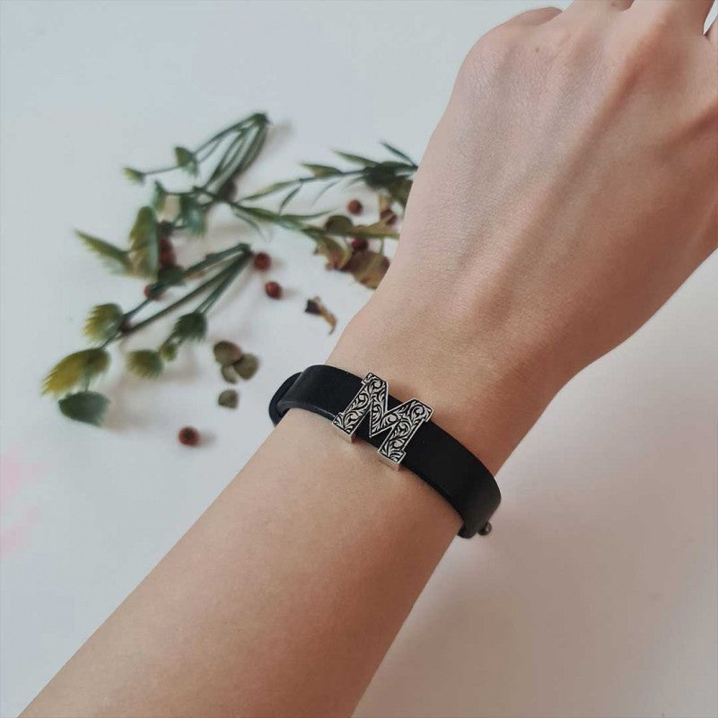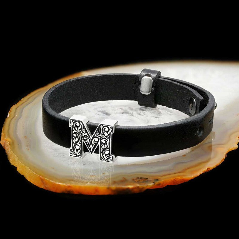 925 Sterling Silver Motif M Letter Leather Bracelet