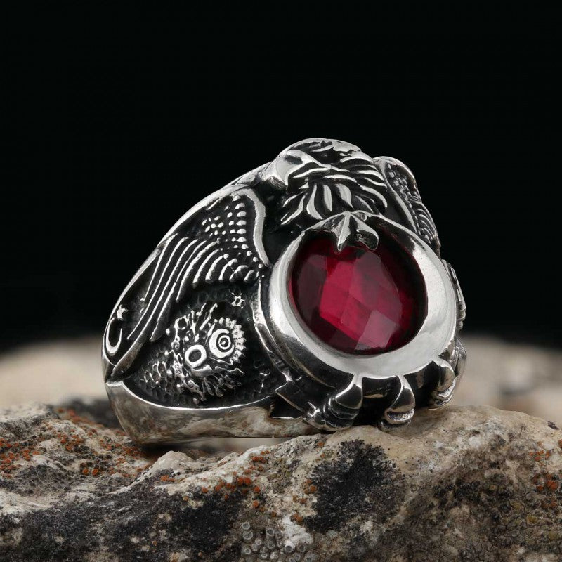 925 Sterling Silver Stoned Eagle Head Tughra Ring