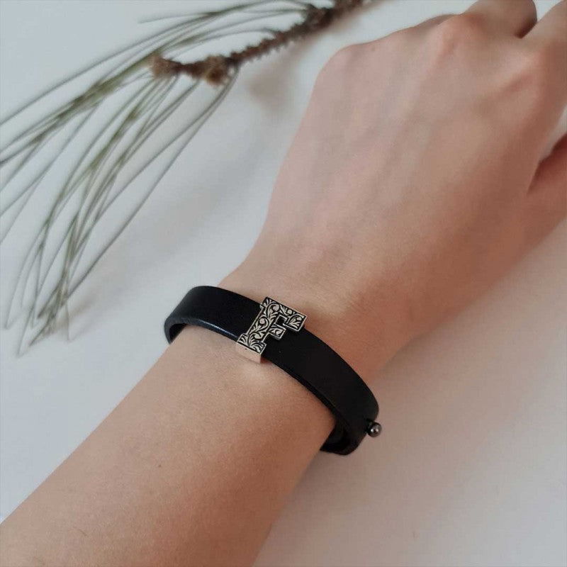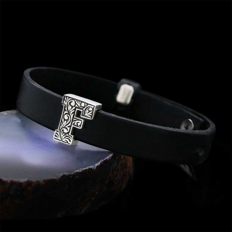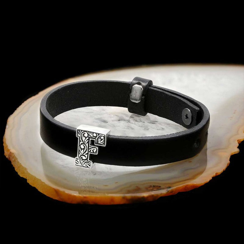 Motif 925 Sterling Silver Letter F Leather Bracelet