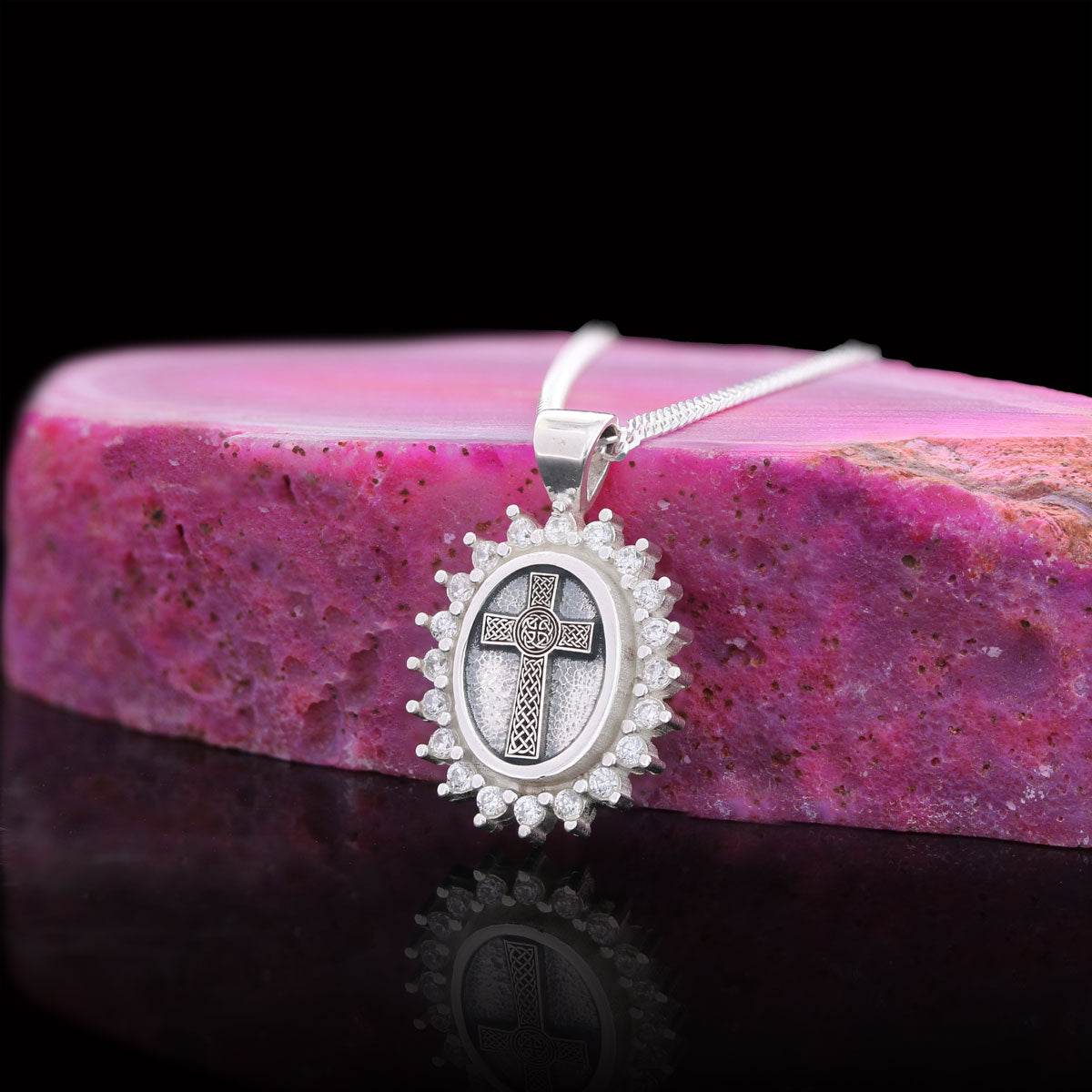 Silver Oval Cross Necklace, Stone Cross Silver Necklace, Gold Plated Silver Christian Cross Stone Necklace, Women's Religious Necklace