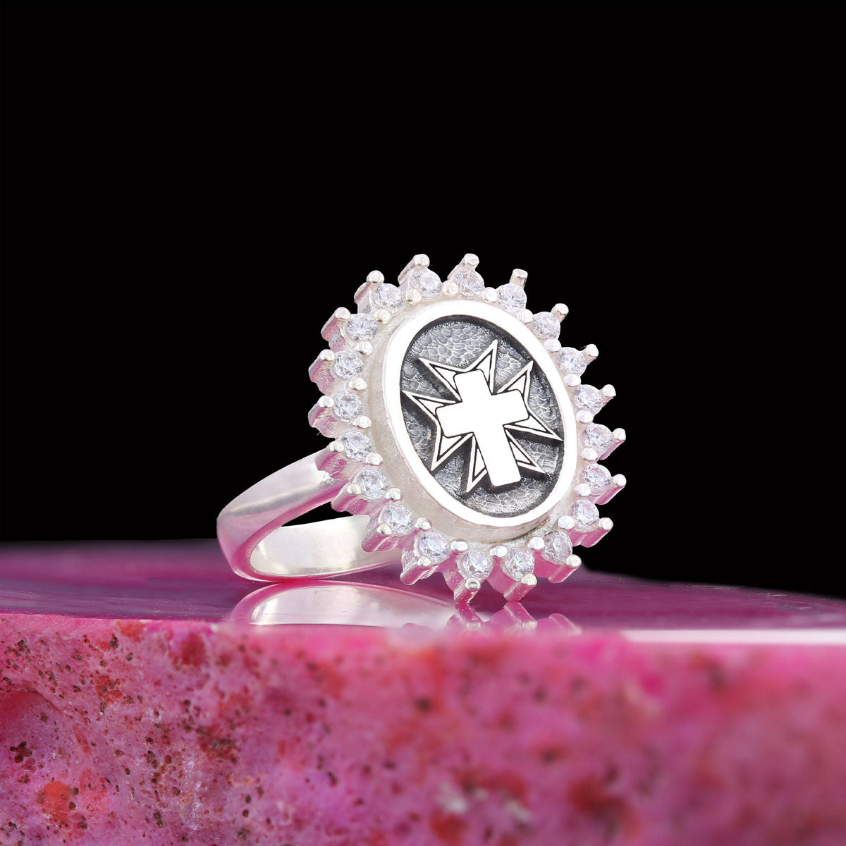 Stone Cross Silver Ring, Gold Plated Silver Christian Cross Stone Ring, Silver Oval Cross Ring, Christian Gift