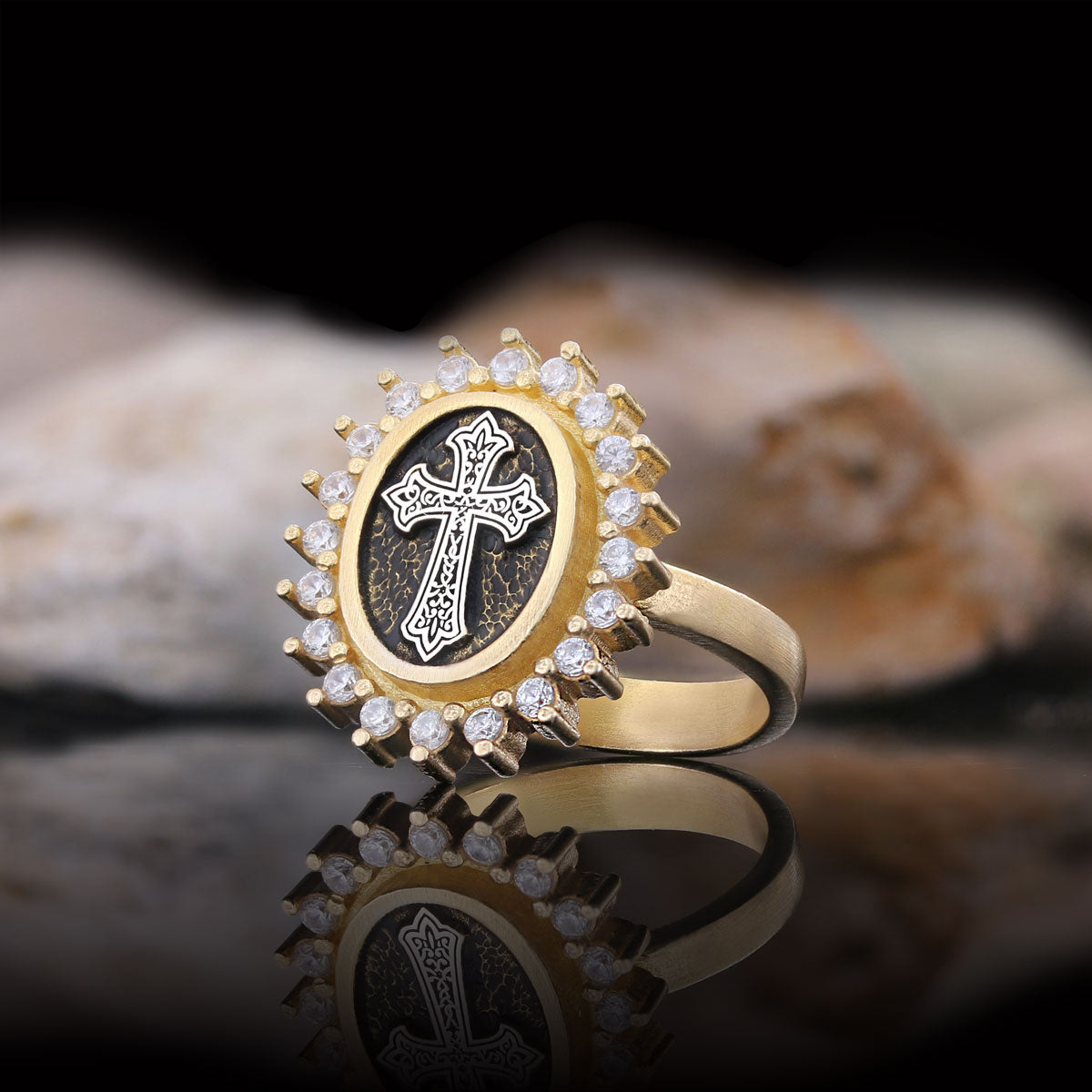Stone Special Motif Ring, Gold Plated Silver Crusader Christian Ring, Rhodium Plated Stone Oval Silver Ring, Crusader Women's Jewelry Gift