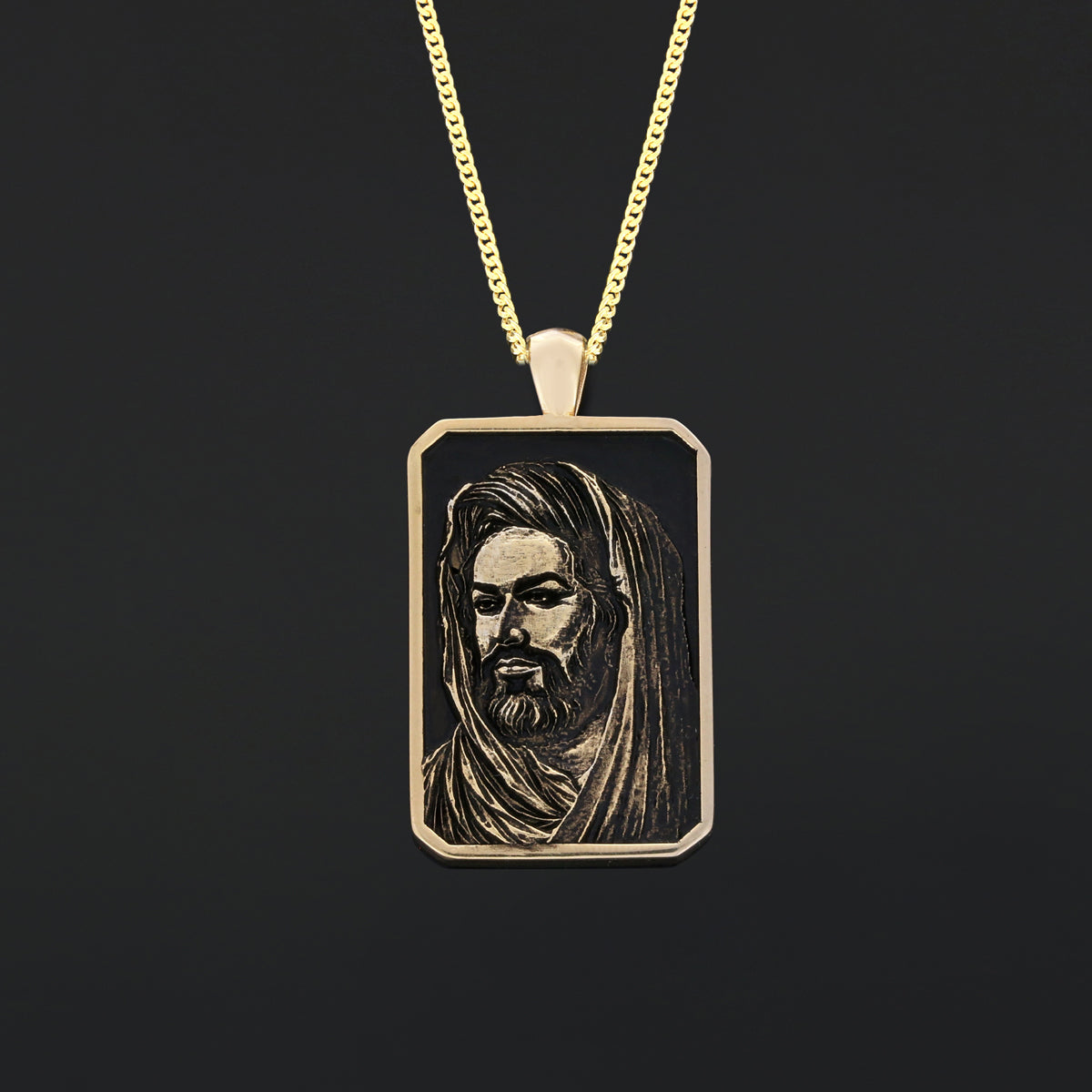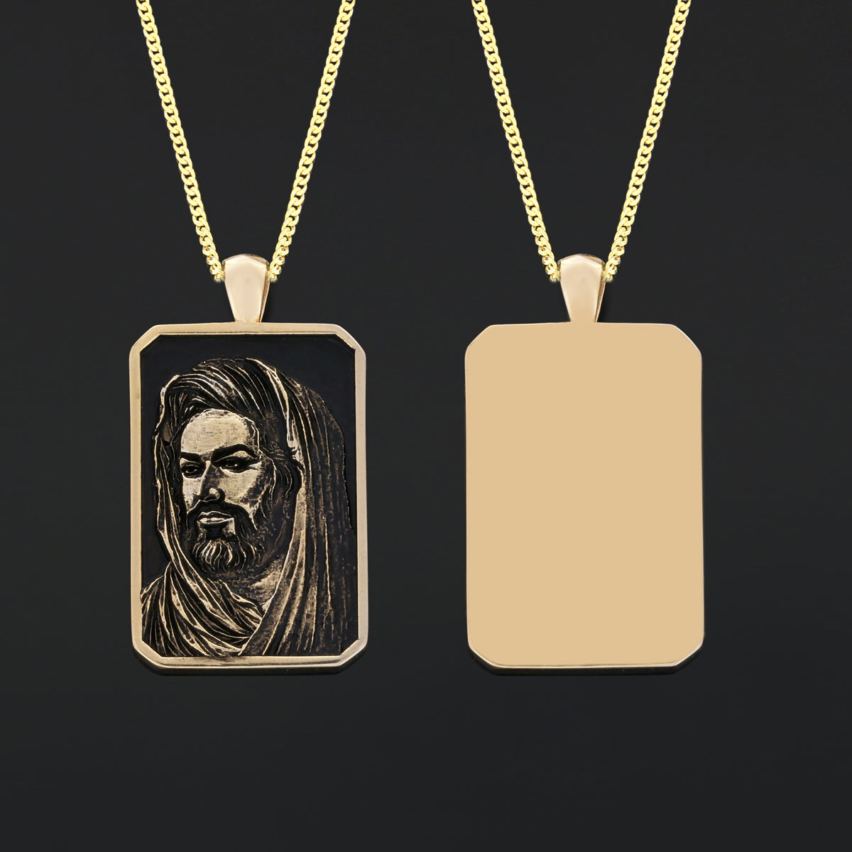 Hazrat Ali Face Necklace, Islamic Rectangular Pendant, Dhulfiqar Jewelry, Zulfiqar Face Necklace, Zulfiqar Jewelry, Muslim Silver Necklace Medium-Gold Coating