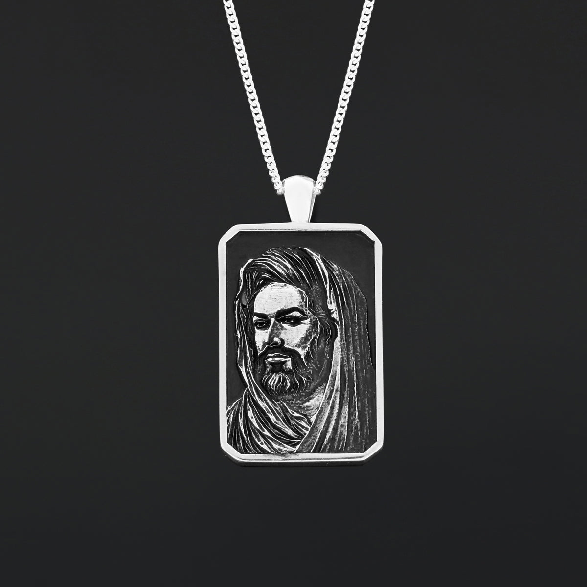 Hazrat Ali Face Necklace, Islamic Rectangular Pendant, Dhulfiqar Jewelry, Zulfiqar Face Necklace, Zulfiqar Jewelry, Muslim Silver Necklace Medium-Silver