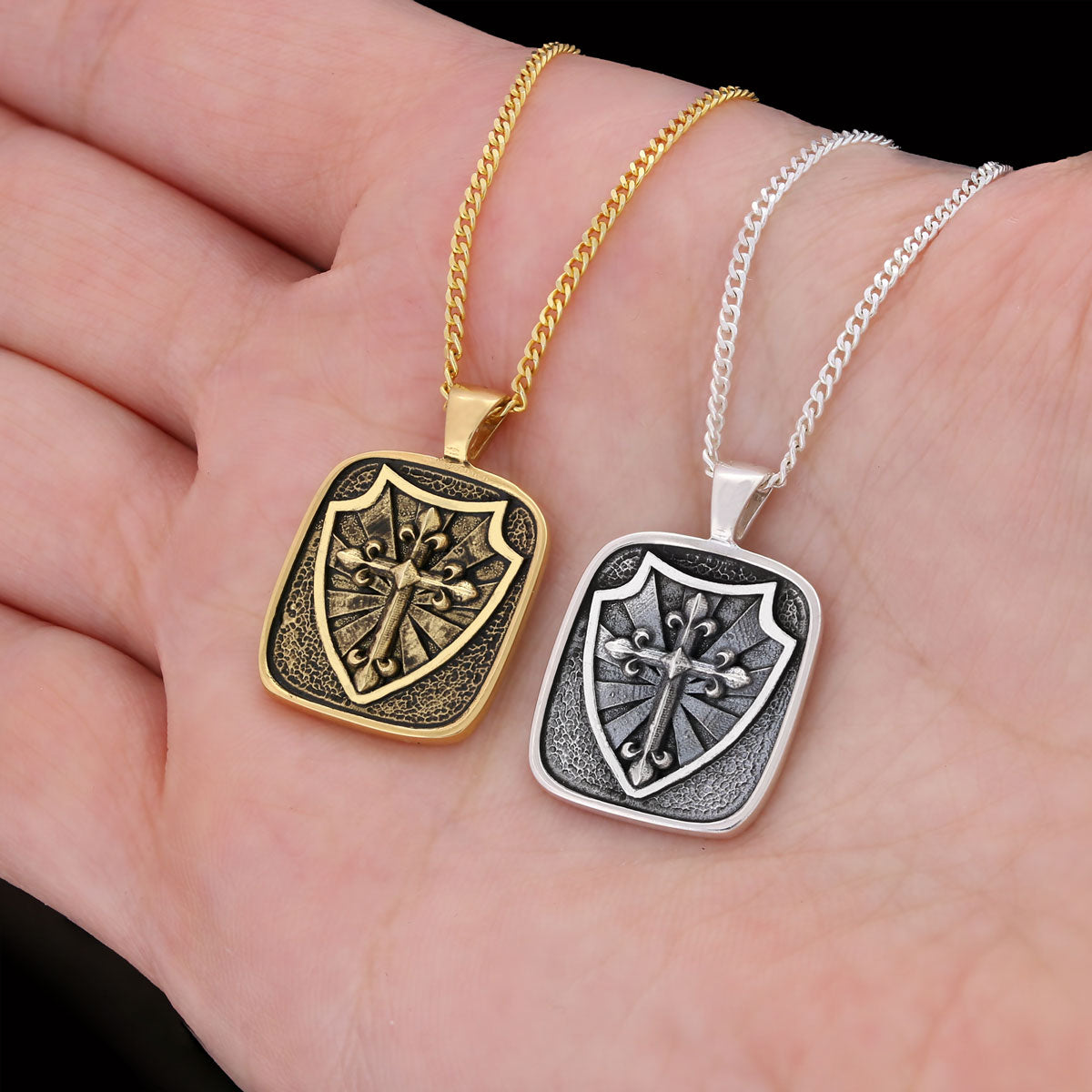 Knight's Cross and Shield Necklace, Silver Shield Necklace, Religious Gift for Men, Christian Armor Jewelry, Crusader Accessory