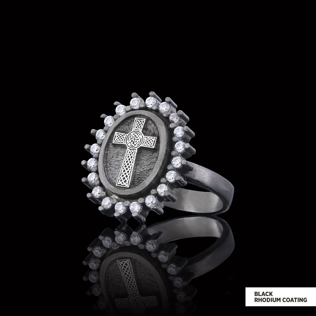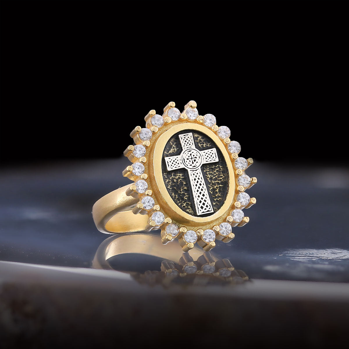 Silver Oval Cross Ring, Stone Cross Silver Ring, Gold Plated Silver Christian Cross Stone Ring, Women's Religious Ring