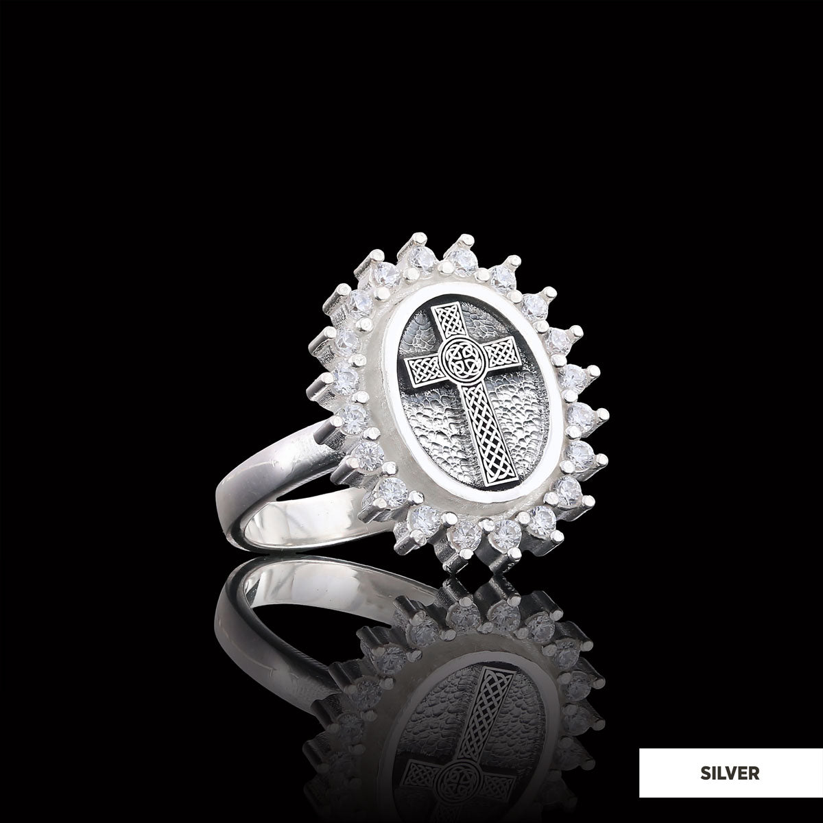 Silver Oval Cross Ring, Stone Cross Silver Ring, Gold Plated Silver Christian Cross Stone Ring, Women's Religious Ring Silver