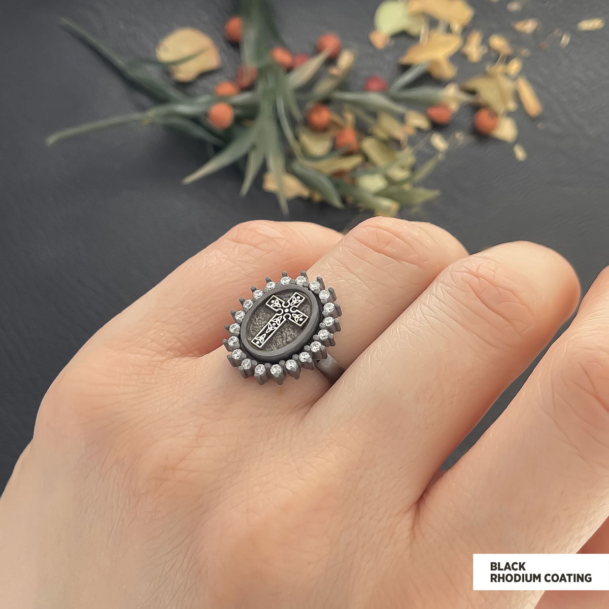 Special Design Stone Motif Ring, Gold Plated Silver Crusader Christian Ring, Stone Oval Silver Ring, Crusader Women's Jewelry Black Rhodium Coating