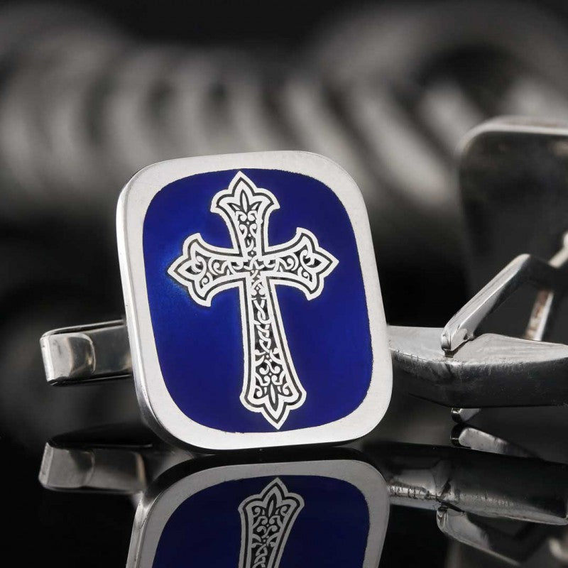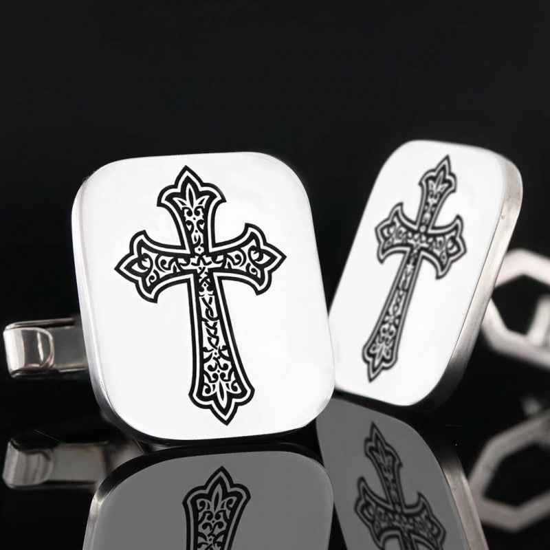 Square Custom Design Silver Christian Cross Embroidered Cufflink