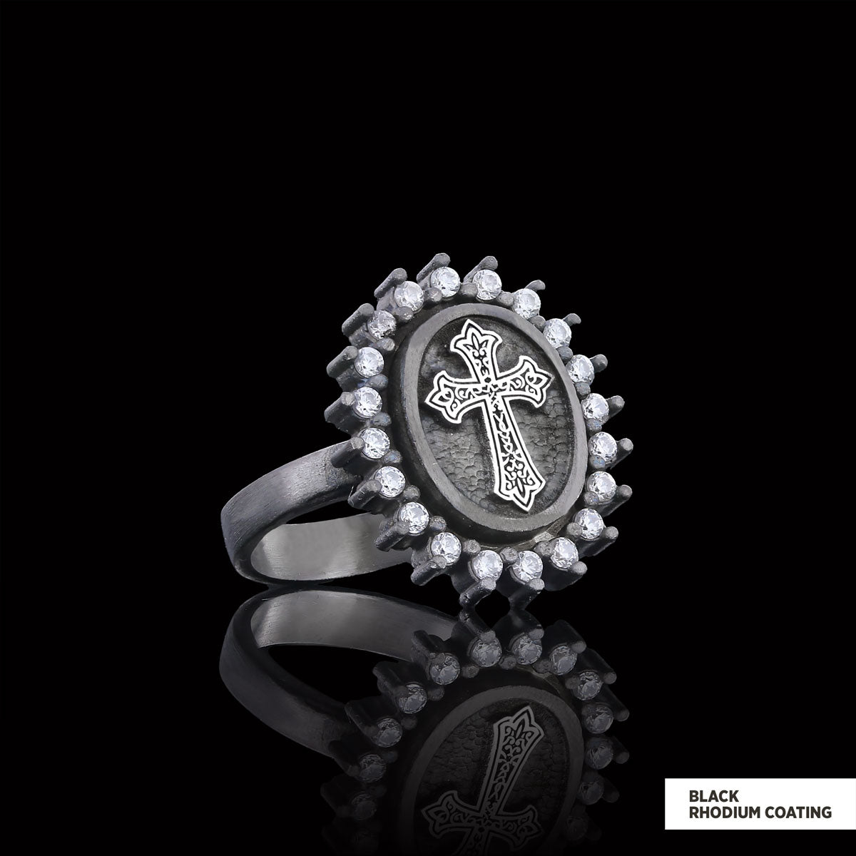 Stone Special Motif Ring, Gold Plated Silver Crusader Christian Ring, Rhodium Plated Stone Oval Silver Ring, Crusader Women's Jewelry Gift