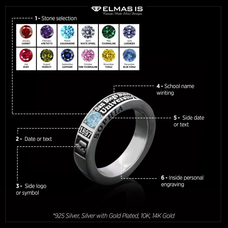 Unique Design Sterling Silver San Diego State University Class Band Ring