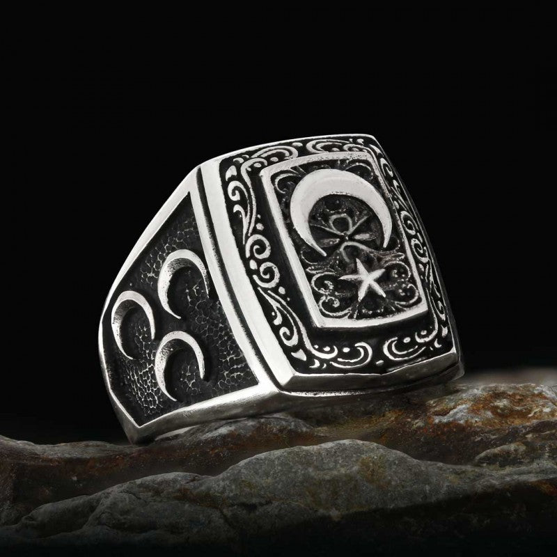 Unique Howling Wolf with Crescent&Star Motif Ottoman Ring